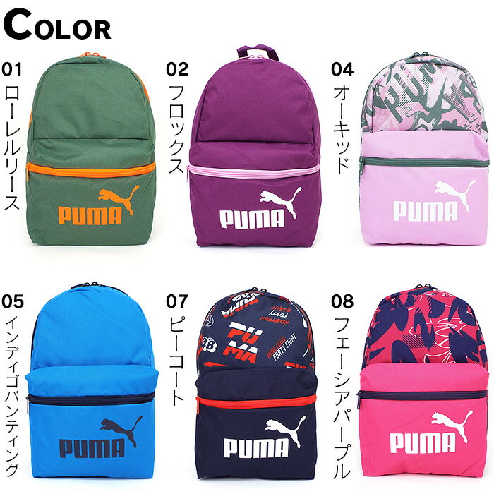 Details ■Brand puma プーマ ■Item フェイズ スモールバックパック リュックサック 075488 ■Size 25×36×12cm ■Color ・01:ローレルリース ・02:フロックス ・04:オーキッド ・05:インディゴバンティング ・07:ピーコート ・08:フェーシアパープル ■重量 約200g前後 ■容量 約13L ■素材 ポリエステル ■Spec ・前面にファスナーポケット ・メイン収納(B5対応) ・リフレクター付き Comment カラフルなキッズ向けリュック 普段使いや、通園、通学、遠足などにお勧め。